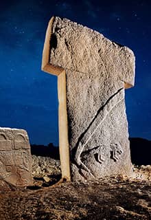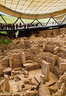 Ubicado a 20 km al noreste del centro de la ciudad de Şanlıurfa, no hay ningún asentamiento en el sitio o cerca de él, lo que cuestiona las teorías y la literatura existentes sobre la vida sedentaria, ya que Göbeklitepe era un templo, una arquitectura sagrada con varias salas donde colosales figuras antropomórficas, estatuas, pilares en forma de T, relieves, tótems y muchas otras obras talladas en piedra construidas por cazadores-recolectores hace alrededor de unos 12.000 años y que alguna vez estuvieron en pie.